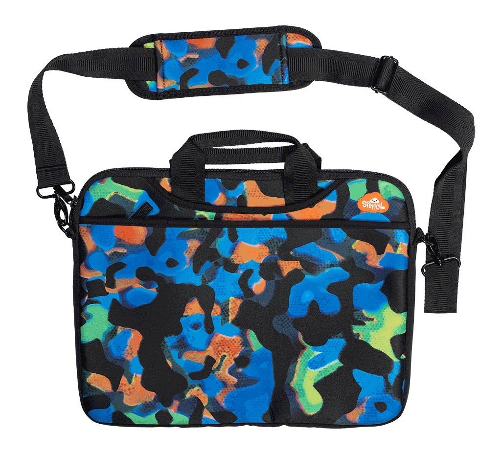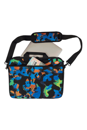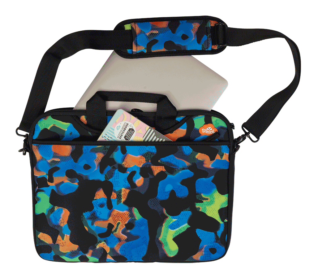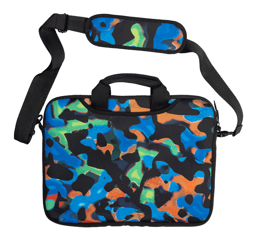 Laptop Bag - Virtual Camo: ightweight, durable, and functional, this neoprene laptop bag is ideal for the older kids carrying their precious tech to, from and around school. Designed to protect laptops from bumps, scratches, and dirt. Stylish as it's functional, our laptop bag is made from high-quality neoprene materials. With padded lining and deep side pockets to fit their mouse, cables and all their other accessories or notebooks. Fits devices up to 15 inches wide.KEY FEATURESSoft, neoprene scratch protective fabric Adjustable shoulder strap 2 adjustable padded, carry handles 1 main tech compartment with double zip 2 deep side compartments for lead storage with velcro tab Write on name label (inside at back)