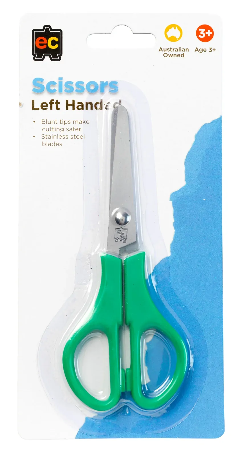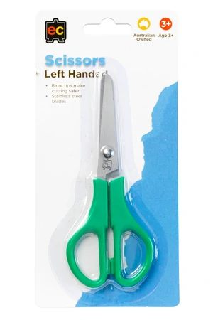 Stainless-steel left-handed scissors (130mm) with plastic handles.