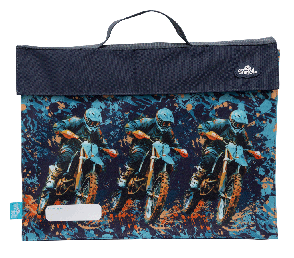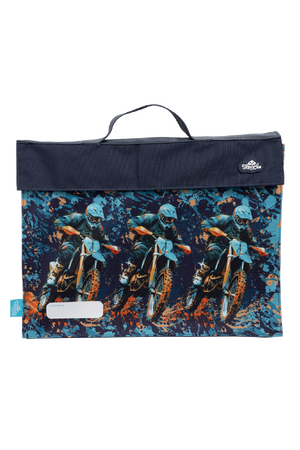 Library Bag - Moto Camo Trax: Packed with wild colours and rugged vibes, Moto Camo Trax is made for kids who love the thrill of biking and aren't afraid to get a little muddy along the way. Adventure-ready and full of fun! Calling all book worms! This gorgeously designed library bag has room for all your kid's essential books. Featuring a PVC coating, nylon inner and velcro fastening, this bag also sports a name pocket and handle. Your child can take this cute and stylish library bag anywhere they want - library, dance classes, swimming, art classes, music lessons and more - all while keeping books or homework safe and protected!