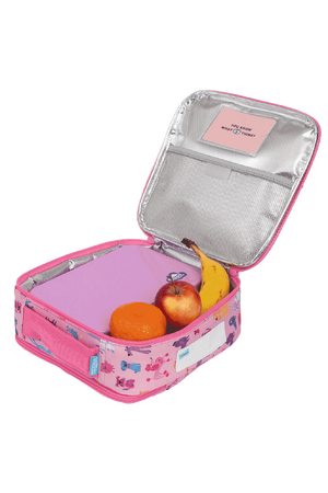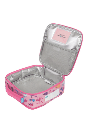 Machine washable Aluminium food-safe insulated lining to keep contents fresher for longer Front zip pocket Dual zip main compartment - easy to open and close Back zip pocket that perfectly fits the Little Chill Pack Thicker, padded handle Outside clear name card pocket 1-compartment mesh pocket inside lid with velcro seal Made with long-lasting durable fabrics Weight: Approx. 215 grams