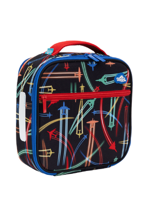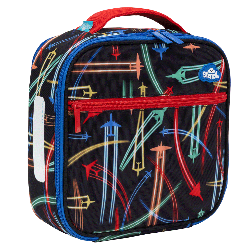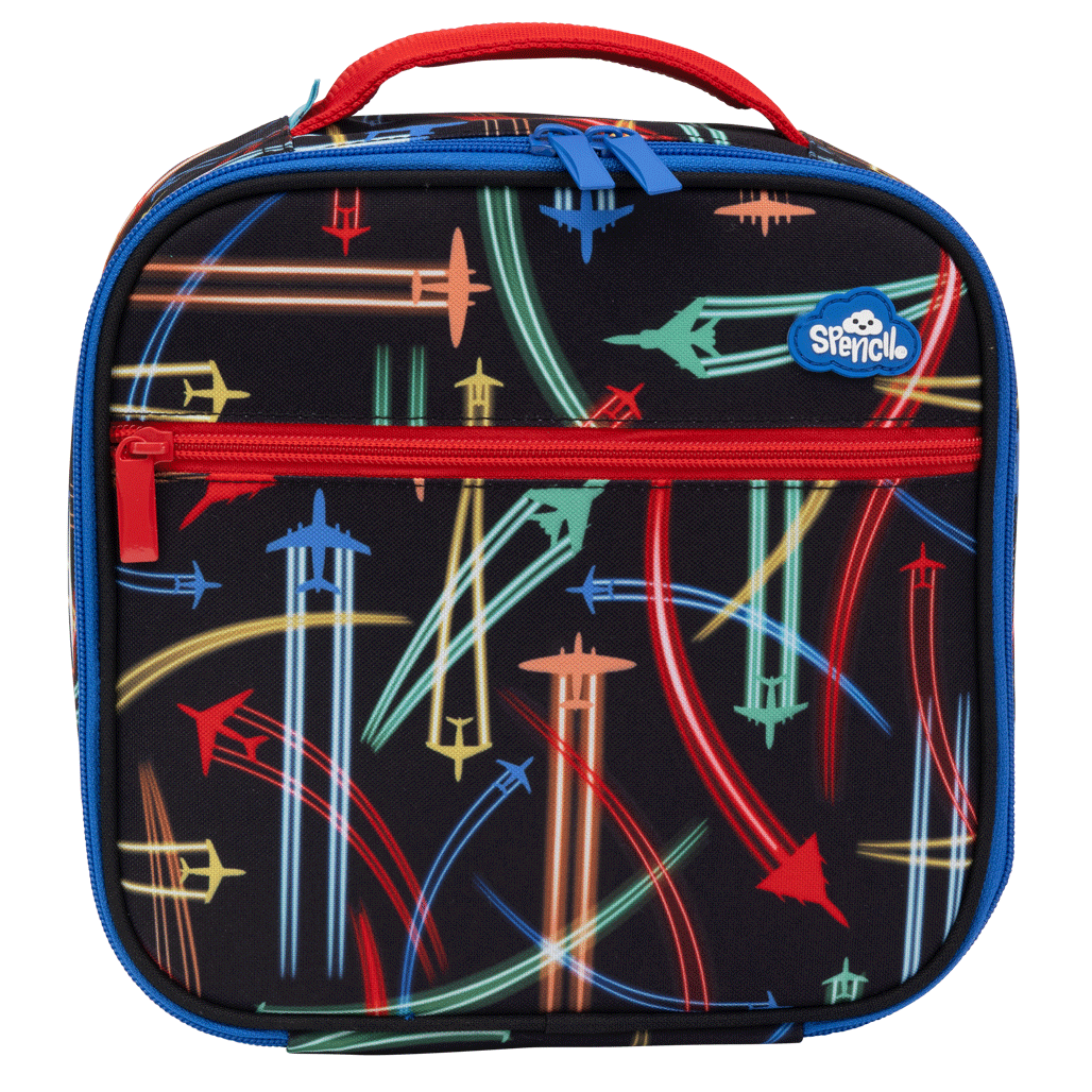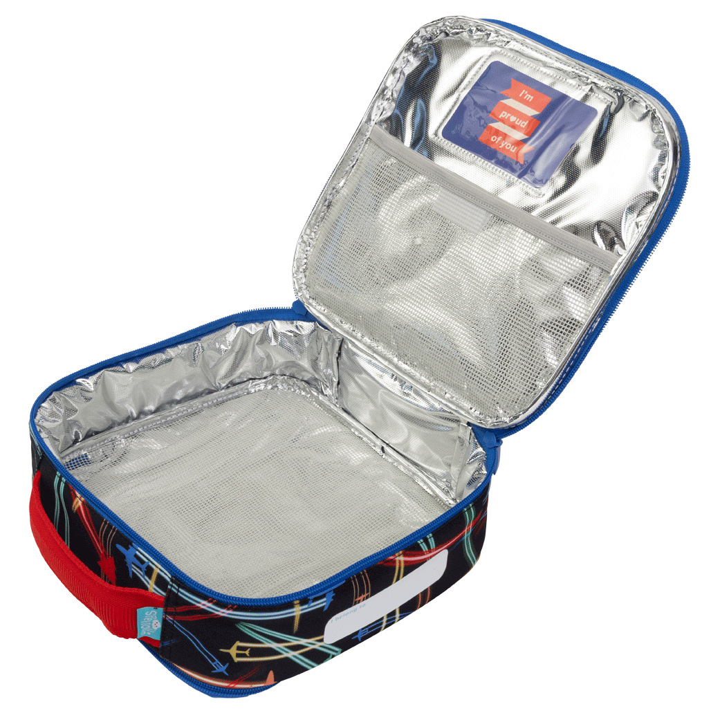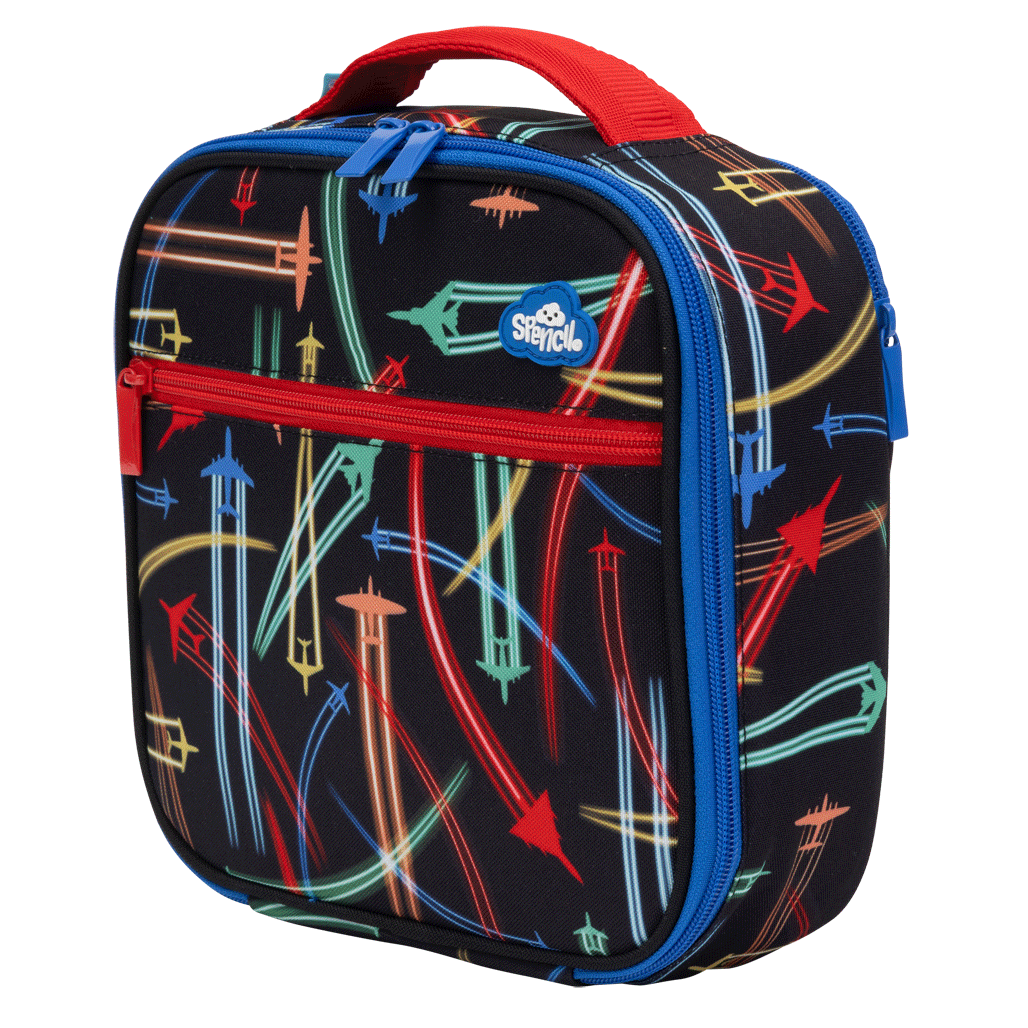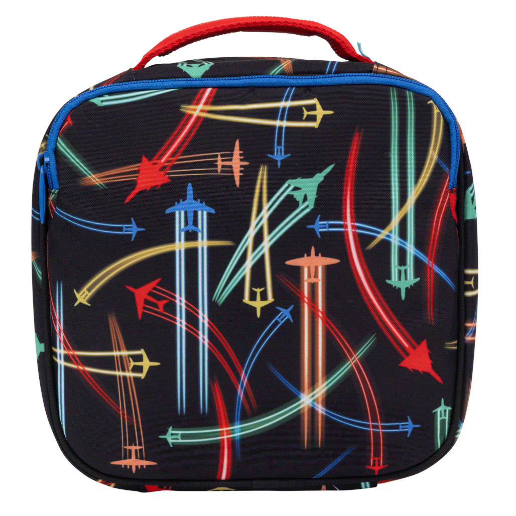Little Cooler Lunch Bag - Jet Planes: Ready for take-off? Jet Planes is bursting with bold colours and high-flying fun! Zooming across a jet-black sky, these speedy planes leave streaks of colour wherever they go. Perfect for little adventurers with big imaginations!