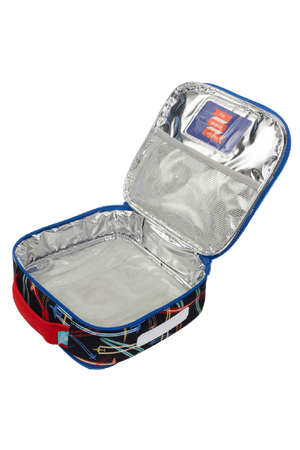 Machine washable Aluminium food-safe insulated lining to keep contents fresher for longer Front zip pocket Dual zip main compartment - easy to open and close Back zip pocket that perfectly fits the Little Chill Pack Thicker, padded handle Outside clear name card pocket 1-compartment mesh pocket inside lid with velcro seal Made with long-lasting durable fabrics Weight: Approx. 215 grams