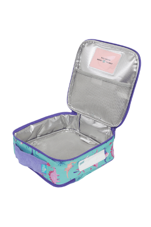 Machine washable Aluminium food-safe insulated lining to keep contents fresher for longer Front zip pocket Dual zip main compartment - easy to open and close Back zip pocket that perfectly fits the Little Chill Pack Thicker, padded handle Outside clear name card pocket 1-compartment mesh pocket inside lid with velcro seal Made with long-lasting durable fabrics Weight: Approx. 215 grams