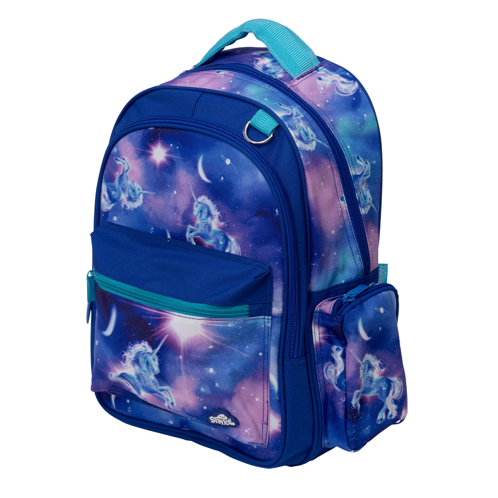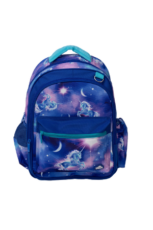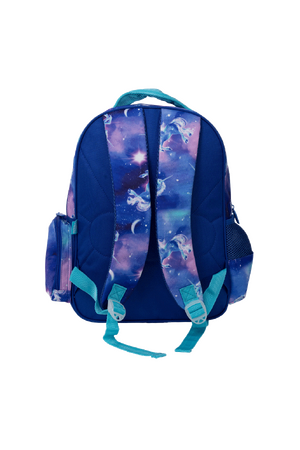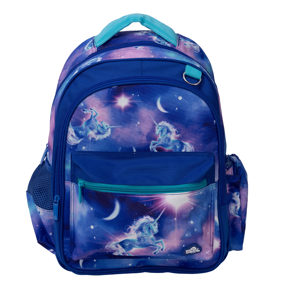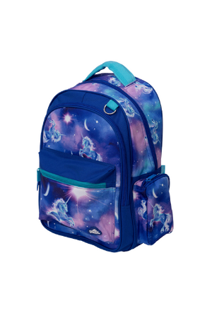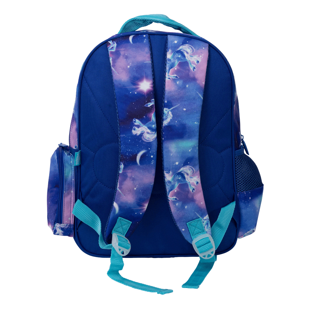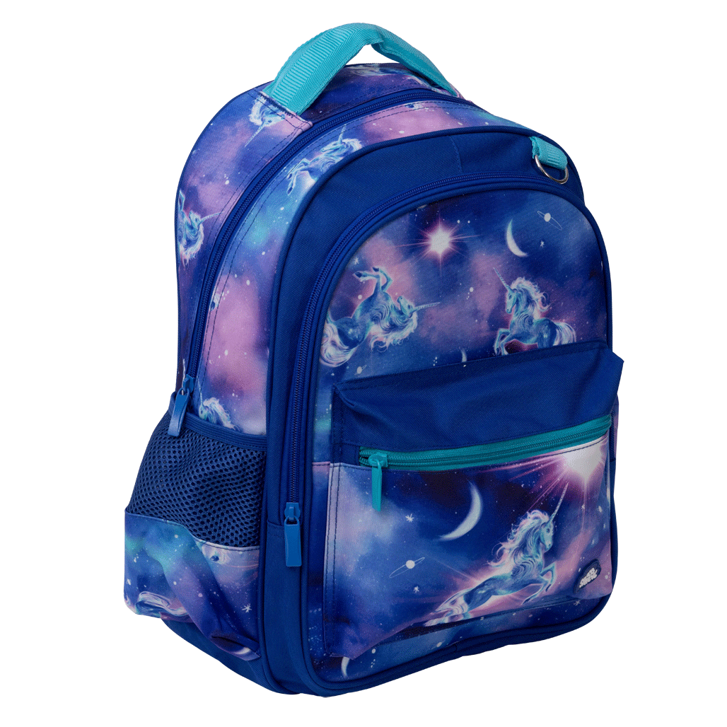 Little Kids Backpack - Moonlit Unicorn: Under a starlit sky, magic comes to life! Moonlit Unicorn is a dreamy swirl of twilight colours, sparkling stars and one truly majestic unicorn. It's pure enchantment for kids who believe in a universe full of wonder. Little kids need little products, like this perfectly sized Little Backpack for growing bodies! A new and improved design, you'll love the updated features such as a side zip pocket, D-loop for attaching bag tags or keychains and a padded top carry handle for little hands. It also sports a water bottle compartment, a compartment with laptop/tablet holder and middle zipped pocket for lunch bags and lunch boxes making this bag both super cute AND practical!