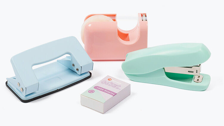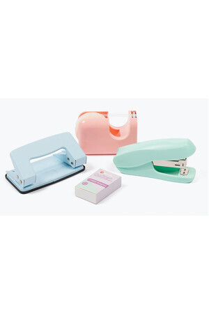 - Includes a stapler with 1,000 staples, tape dispenser and tape, and hole punch