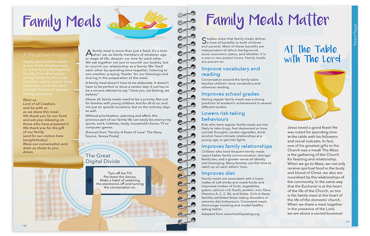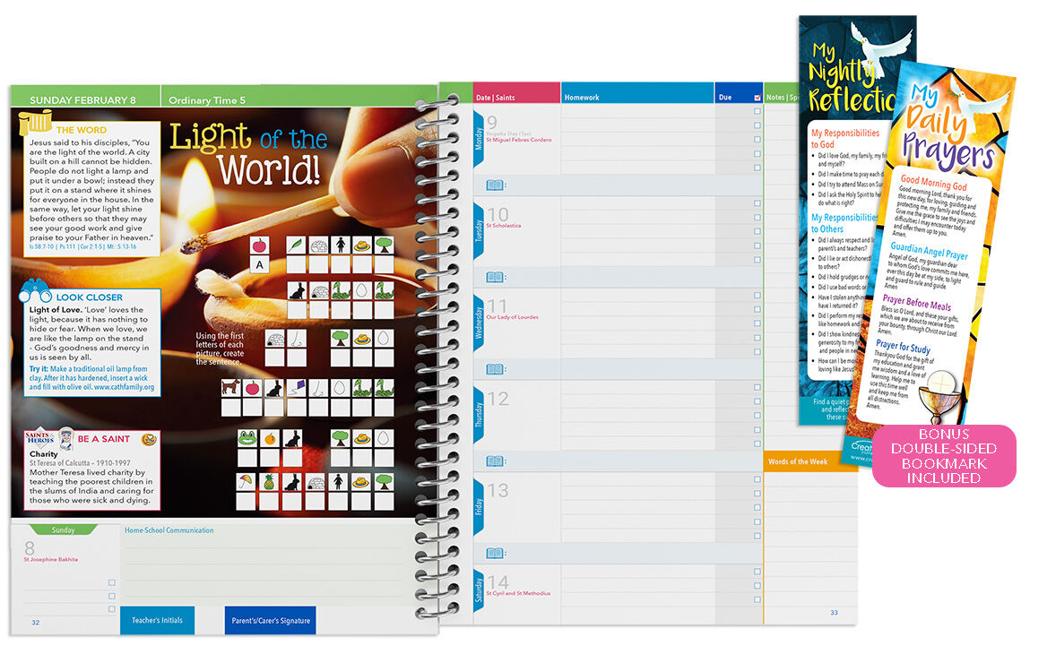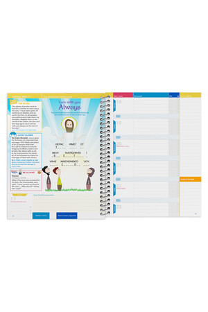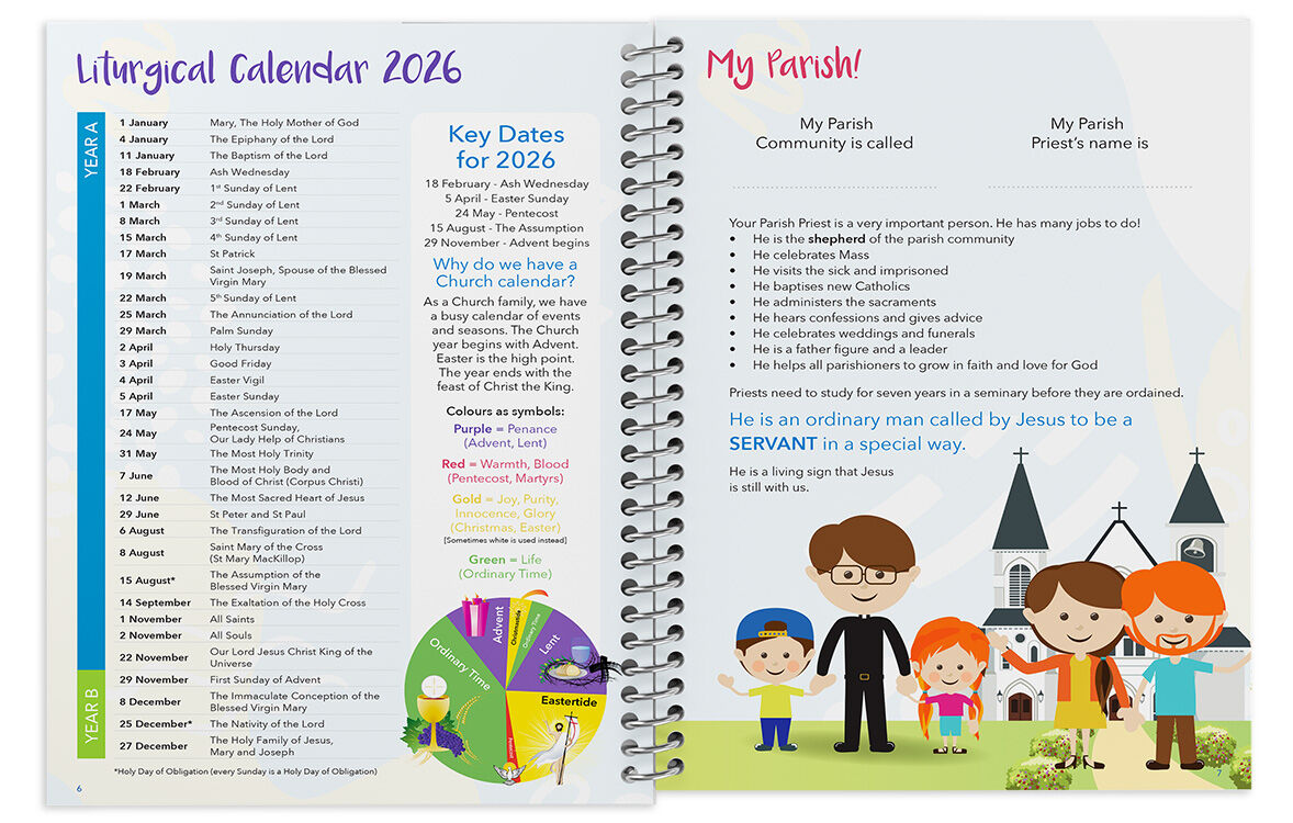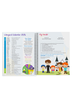 This diary is filled with beautifully illustrated, interactive content that inspires and enriches students’ understanding of the Catholic faith. Each weekly spread highlights the Sunday Liturgy, providing opportunities for reflection and deeper engagement with the Gospel readings, alongside practical features for homework and school communication.