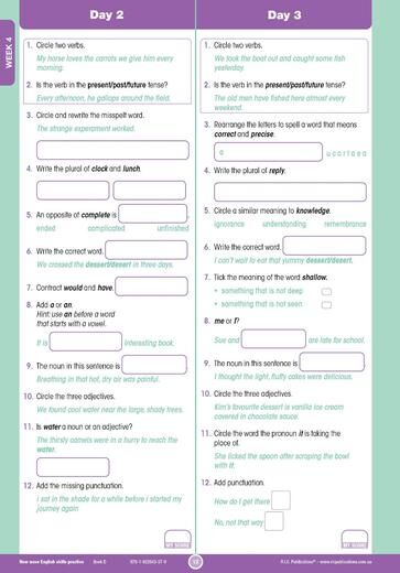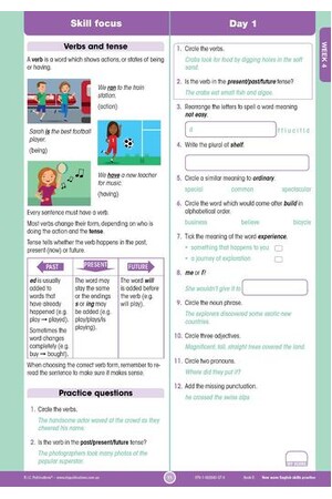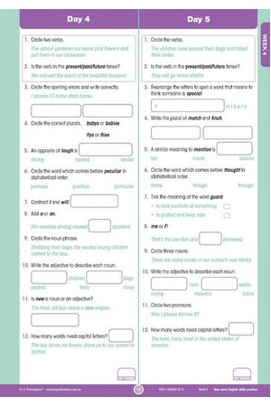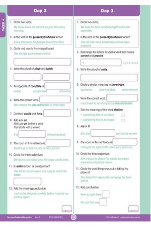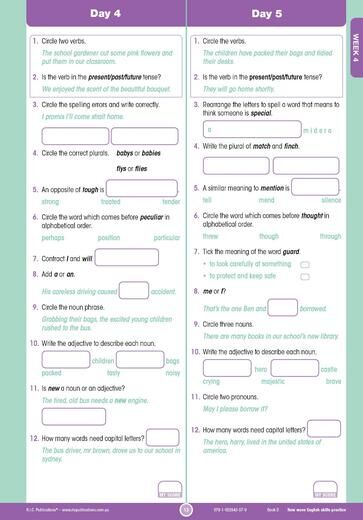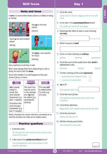 In this daily practice workbook for Year 4, there are questions to answer in the areas of phonological awareness, reading comprehension, spelling, word study, punctuation and grammar. The revised workbooks have 160 days of questions, broken into four groups of eight weeks. Skill focuses are included to help scaffold students with more challenging concepts that are covered throughout the books. A dedicated skill focus section provides students with daily practice of the focus skill, while the mixed questions will help students improve and consolidate their English skills as well as their knowledge about how language works.
