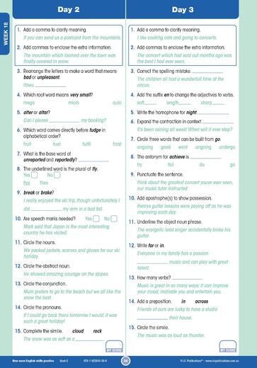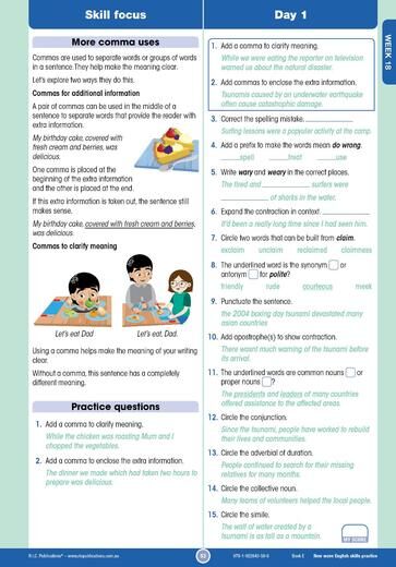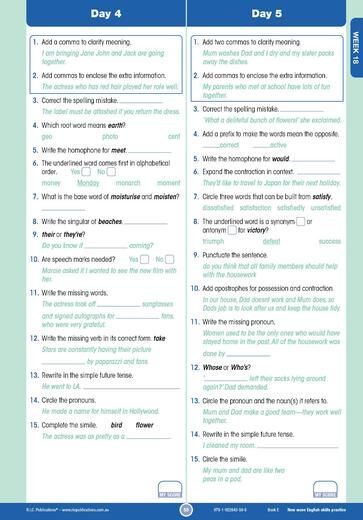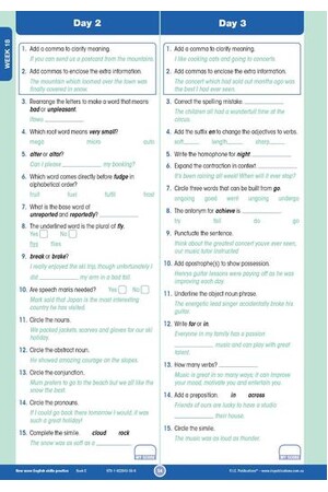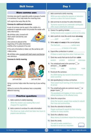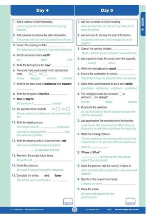 In this daily practice workbook for Year 5, there are questions to answer in the areas of phonological awareness, reading comprehension, spelling, word study, punctuation and grammar. The revised workbooks have 160 days of questions, broken into four groups of eight weeks. Skill focuses are included to help scaffold students with more challenging concepts that are covered throughout the books. A dedicated skill focus section provides students with daily practice of the focus skill, while the mixed questions will help students improve and consolidate their English skills as well as their knowledge about how language works.