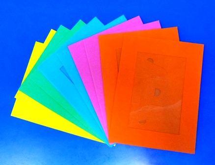 Assorted colours: pink, red, yellow, green & blue. Measures 115 x 165mm
