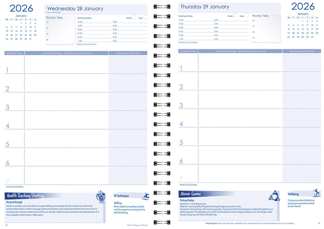 The Physical Education Strategy Planner 2026 (Daily) - Wiro Bound is designed for both primary and secondary PE teachers, offering a 7-period, day-to-a-page layout. It combines detailed daily planning with over 200 minor games, PE techniques, and wellbeing strategies to enhance your health and PE classes.