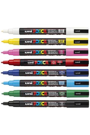 These Uni POSCA PC-3M Poster Markers have water-based pigments which can be blended when wet or overlaid when dry. They have a fine bullet tip which lets you draw lines that can be read from a distance. The ink produces opaque results that won't fade over time.