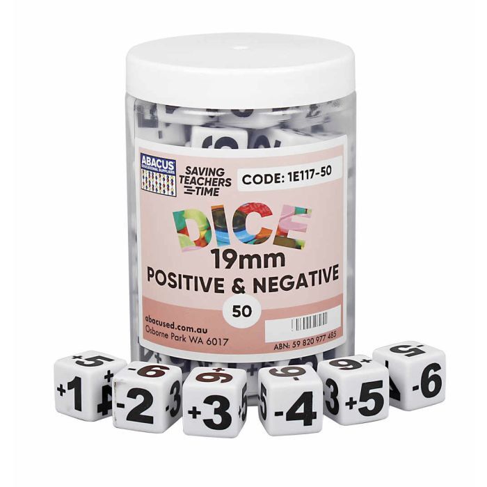 Introduce your class to the dynamic world of mathematics with the "Positive and Negative Dice - 19mm (Jar of 50)", a perfect tool for exploring basic numeracy skills including the creation of randomly generated equations and the visualisation of the number line from -6 to +6.