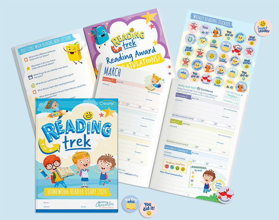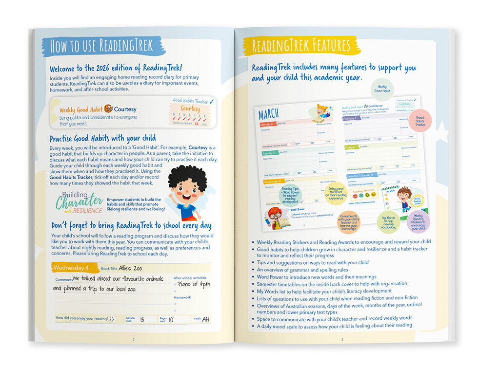 The ReadingTrek 2026 (Years K-4) Home Reader Diary is a colourful, interactive weekly reading log that helps students in Years K–4 record and celebrate their reading. With ‘Word Power’ vocabulary each week, motivating good habits, and a reading and vocabulary tracker, young readers—and their teachers, parents, or carers—can monitor progress with ease. Four milestone Reading Awards add extra encouragement along the way.