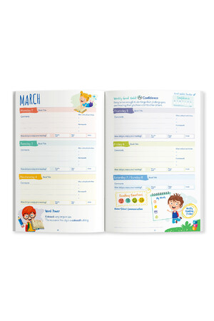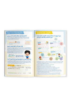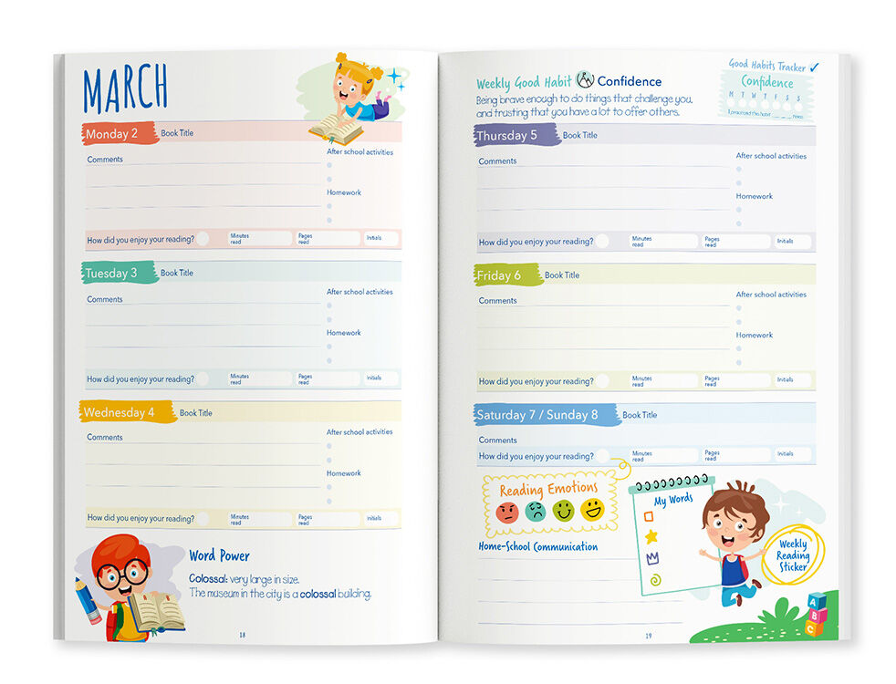 - Sections to record reading progress, homework, and after-school activities