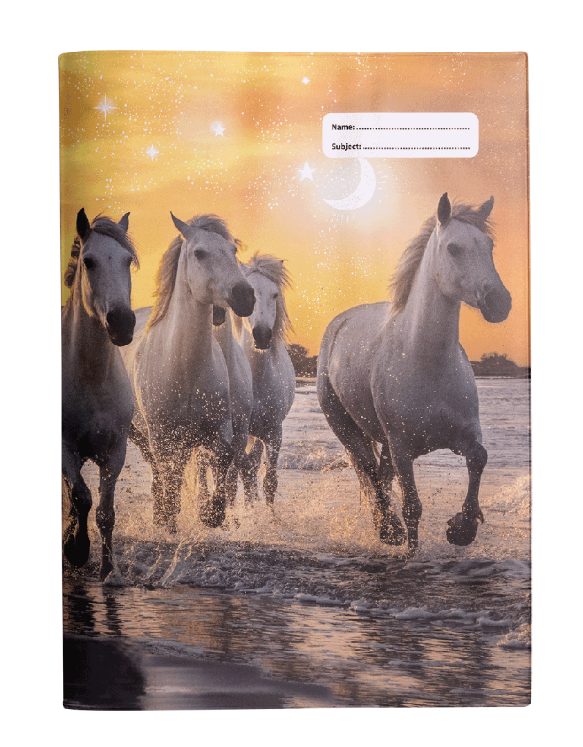 Scrapbook Cover - Cosmic Canter 1: For the horse-mad kids, Cosmic Canter takes their breath away. Taking their imaginations to a place where wild horses run free amidst a cosmic sky, this dreamy design opens up a universe of possibility. Don't wrestle with pesky, sticky book covering when you can cover books in just 10 seconds with this reusable, slip-on school book cover! It's a total game-changer. In Scrapbook size, it fits larger scrapbooks sized 335mm x 245mm or less, and is made from non-toxic certified PVC Reach material. It will surely make back to school easy for you and fun for the kids!
