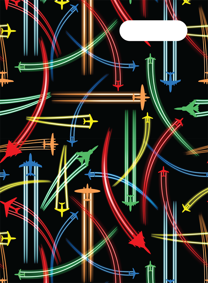 Scrapbook Cover - Jet Planes: Ready for take-off? Jet Planes is bursting with bold colours and high-flying fun! Zooming across a jet-black sky, these speedy planes leave streaks of colour wherever they go. Perfect for little adventurers with big imaginations! Don't wrestle with pesky, sticky book covering when you can cover books in just 10 seconds with this reusable, slip-on school book cover! It's a total game-changer. In Scrapbook size, it fits larger scrapbooks sized 335mm x 245mm or less, and is made from non-toxic certified PVC Reach material. It will surely make back to school easy for you and fun for the kids!