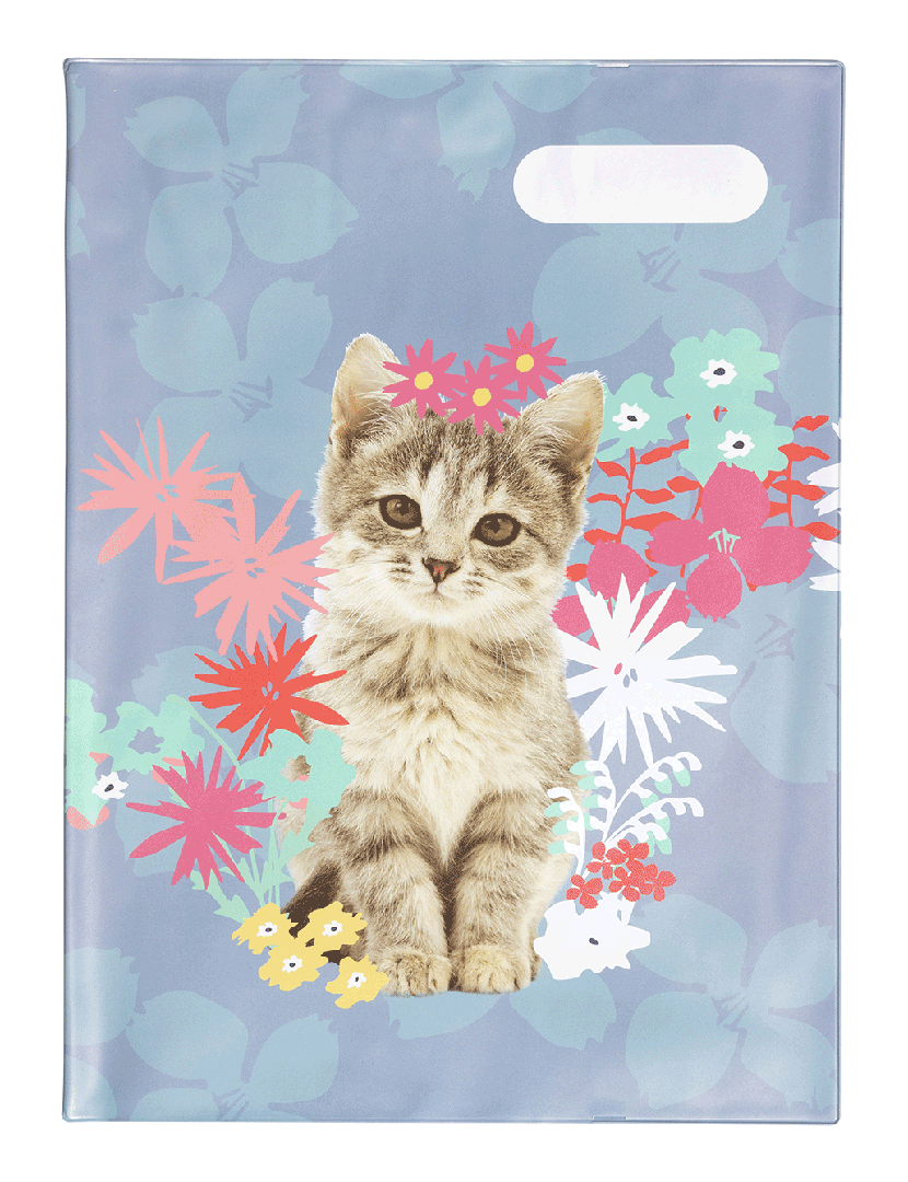 Scrapbook Cover - Miss Meow 1: Miss Meow is the sweetest kitty you ever did see. Fluffy and happy, with a sweet flower-crown, she is your little one's new BFF. Don't wrestle with pesky, sticky book covering when you can cover books in just 10 seconds with this reusable, slip-on school book cover! It's a total game-changer. In Scrapbook size, it fits larger scrapbooks sized 335mm x 245mm or less, and is made from non-toxic certified PVC Reach material. It will surely make back to school easy for you and fun for the kids!