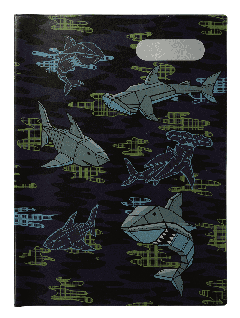 Scrapbook Cover - Robo Shark 1: Is there anything more awe-inspiring than a shark? YEP: a ROBO-SHARK! These fishies make every day fin-tastic! Don't wrestle with pesky, sticky book covering when you can cover books in just 10 seconds with this reusable, slip-on school book cover! It's a total game-changer. In Scrapbook size, it fits larger scrapbooks sized 335mm x 245mm or less, and is made from non-toxic certified PVC Reach material. It will surely make back to school easy for you and fun for the kids!