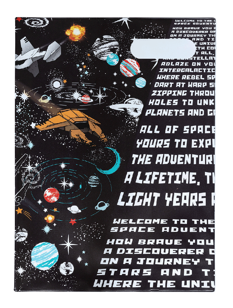 Scrapbook Cover - Space Adventure 1: To the universe and beyond, kids enter an intergalactic mission with the Space Adventure range! They become a discoverer of worlds on a journey through stars and time, perfect for inquisitive minds with an interest in the universe beyond! Don't wrestle with pesky, sticky book covering when you can cover books in just 10 seconds with this reusable, slip-on school book cover! It's a total game-changer. In Scrapbook size, it fits larger scrapbooks sized 335mm x 245mm or less, and is made from non-toxic certified PVC Reach material. It will surely make back to school easy for you and fun for the kids!
