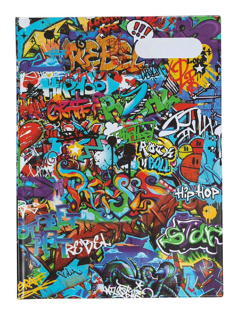 Scrapbook Cover - Street Art 1: For the Rebels with a Cause, Street Art is a super-cool design to inspire creativity, art and a whole lot of fun! Don't wrestle with pesky, sticky book covering when you can cover books in just 10 seconds with this reusable, slip-on school book cover! It's a total game-changer. In Scrapbook size, it fits larger scrapbooks sized 335mm x 245mm or less, and is made from non-toxic certified PVC Reach material. It will surely make back to school easy for you and fun for the kids!