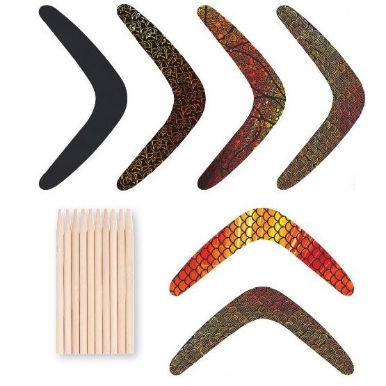 Scratch Boomerangs - Pack of 30 is a set of 30 pre-cut card boomerangs. Each boomerang is 29cm in size. Simply scrape away the black surface coating using the wooden tool provided to reveal earthy colour tones underneath. Create your own designs and patterns. 30 scratch tools included.