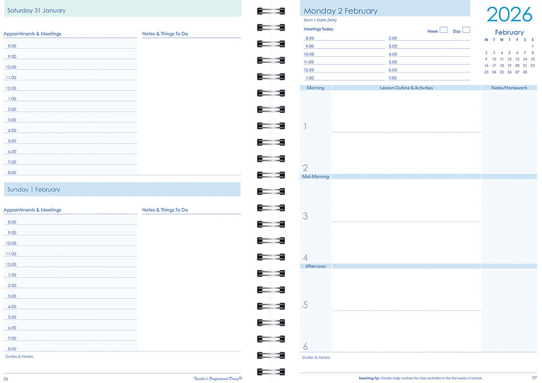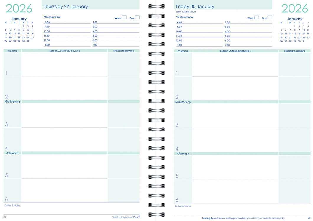 The Secondary Compact A5 Planner 2026 - Wiro Bound features a 6-period, day-to-a-page layout designed for portability without losing functionality. Compact yet practical, it helps teachers stay organised with teaching tips, a daily mini calendar, and detailed scheduling tools.