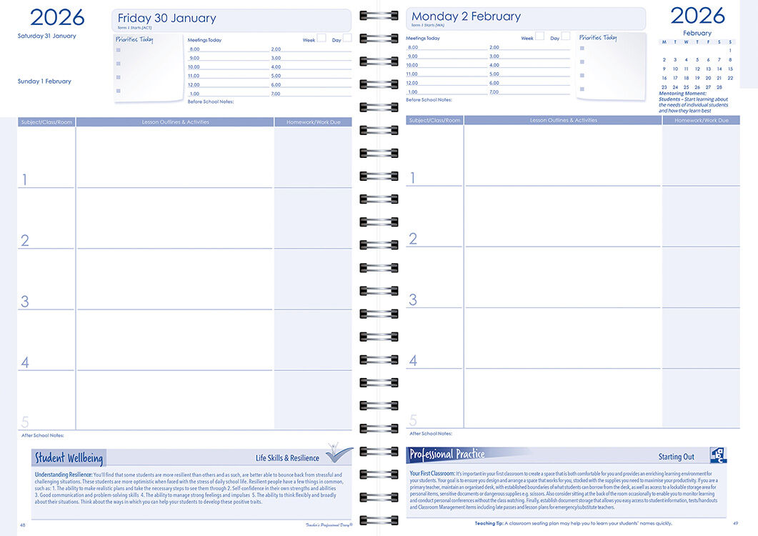 The Secondary Strategy 4-Period Planner 2026 (Daily) - Wiro Bound is designed with a 4-period, day-to-a-page layout to support teachers with strategies that strengthen both professional practice and student wellbeing. It combines detailed daily organisation with evidence-based approaches for effective teaching and resilience in the classroom.