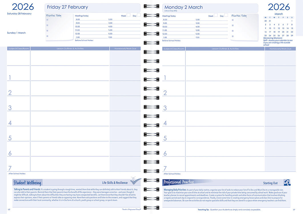 The Secondary Strategy 7-Period Planner 2026 (Daily) - Wiro Bound is designed with a 0 + 7 period, day-to-a-page layout to support teachers with practical strategies that strengthen both professional practice and student wellbeing. This planner combines detailed daily organisation with hundreds of strategies to enhance teaching and learning in the classroom.