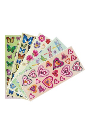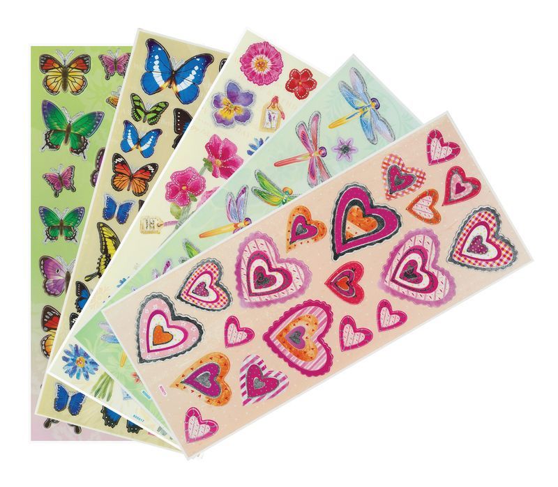 An assortment of 3D coloured stickers with metallic elements suitable for Mother's Day. Pack includes dragonflies, butterflies, hearts and flowers. NB: Some designs may change. Packet of 5 sheets (approx 105 total stickers).