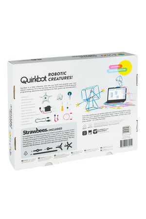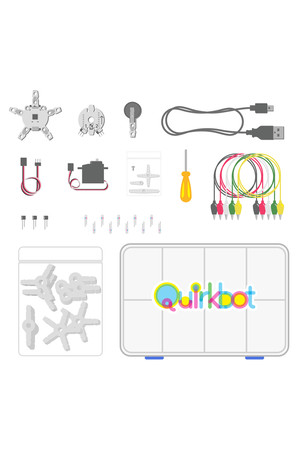 - Pack includes: 1x Quirkbot Board, 1x Motor Backpack, 1x Servo Motor 120°, 1x Small strawbees pack, 1x Electric Strawbee, 1x Straws pack (50 straws) 1x LED 3mm RB, 10x cut legs, Light Sensor, 3x cut legs, 1x USB Cable, Intro Booklet, Sticker, Small screwdriver, 1x Servo extension cable, and 6x Alligator clips