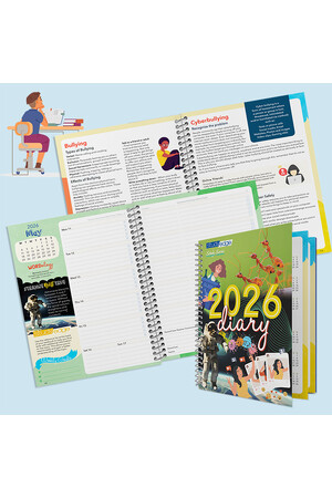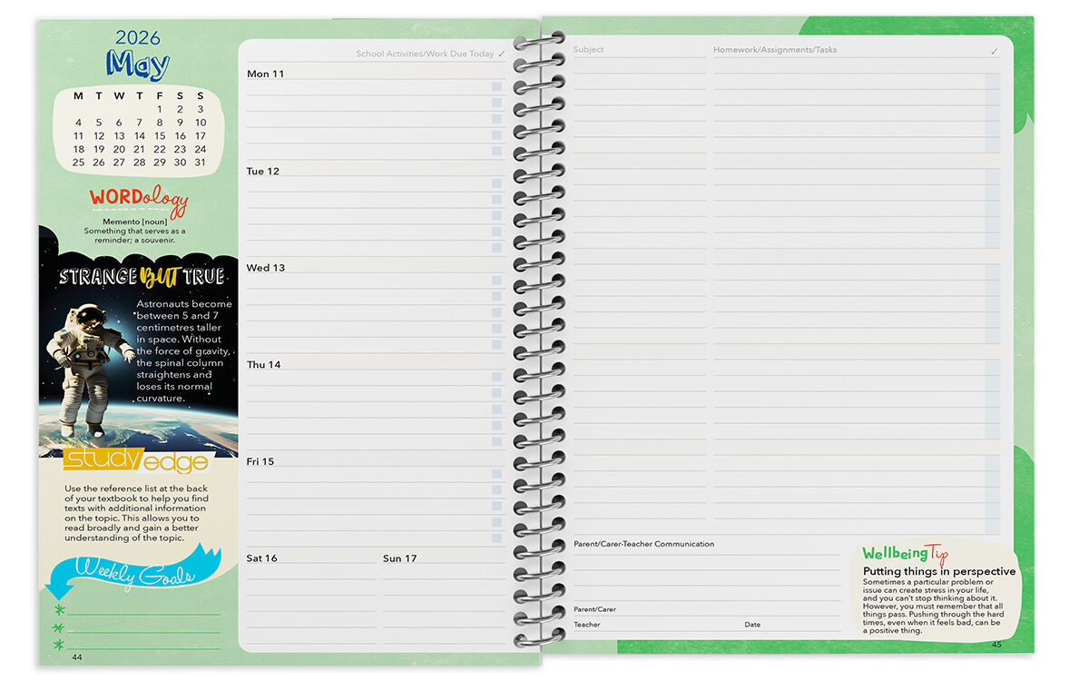 The StudyEdge 2026 (Years 7–12) Student Diary is a colourful and interactive A5 diary designed to give students a competitive edge throughout the school year. Packed with fun facts, study tips, and engaging ‘Wordology’ vocabulary features, it inspires students to stay motivated while keeping their study and personal commitments organised.