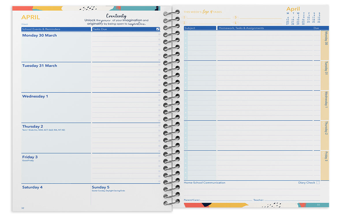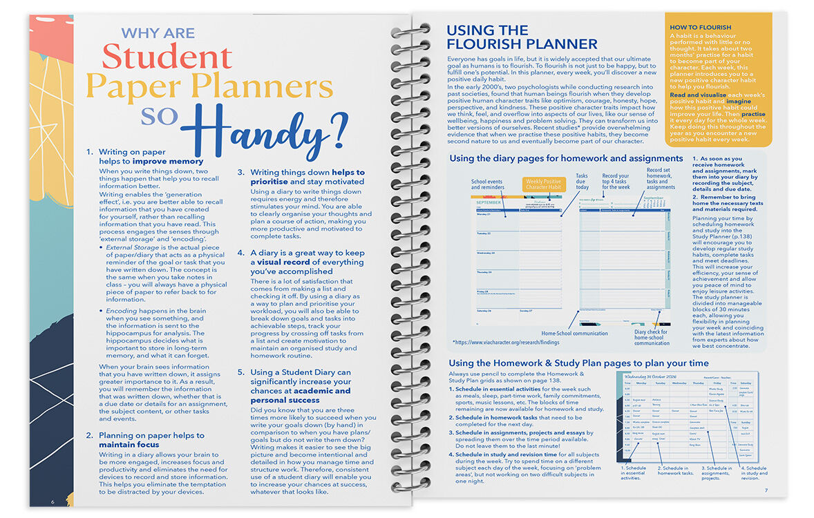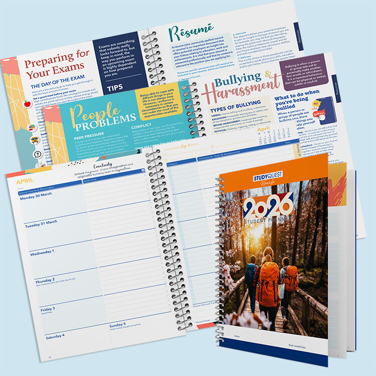 Colourful and engaging, StudyQuest Flourish includes weekly good habits alongside all the essential features that support academic success. On top of an easy-to-use weekly layout, it offers a wide range of resources to help students build strong study habits, stay motivated, and grow personally throughout the year.