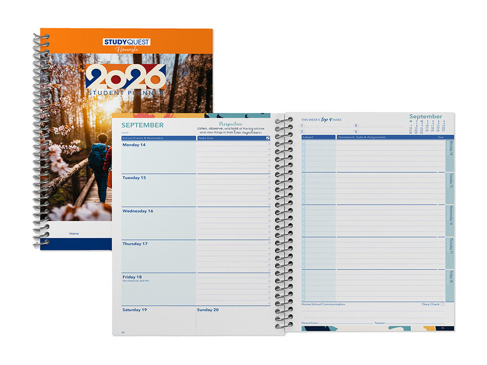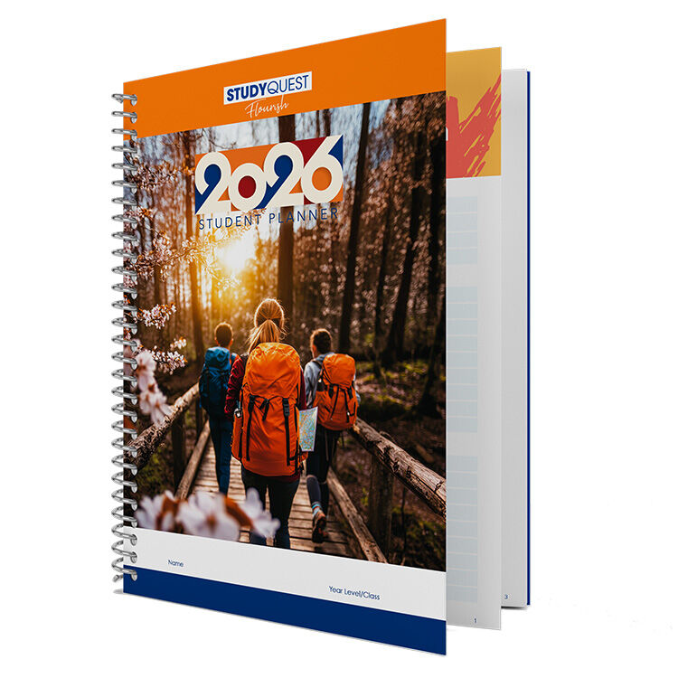 StudyQuest Flourish 2026 (Years 7–12) Student Diary, previously known as the Flourish Student Planner, has been redesigned and optimised for students who thrive on creativity and positive reinforcement. This diary brings bright colours, inspiring quotes, and reflective prompts to students in Years 6–12 each week, encouraging a positive wellbeing mindset. It’s a vibrant companion that keeps motivation high all year long!