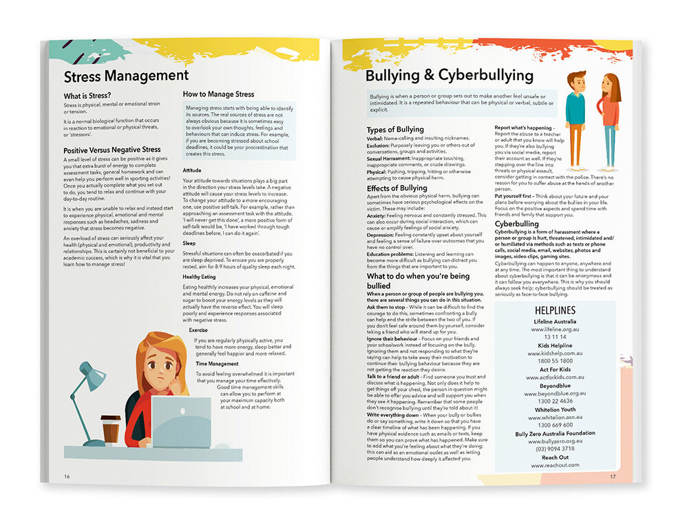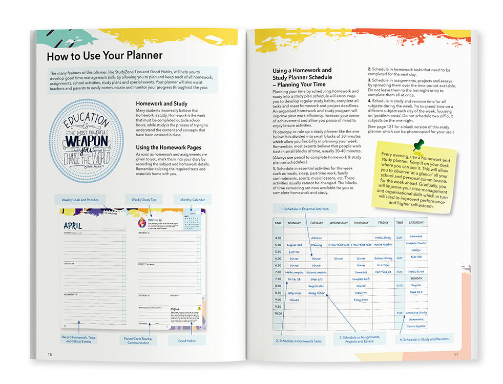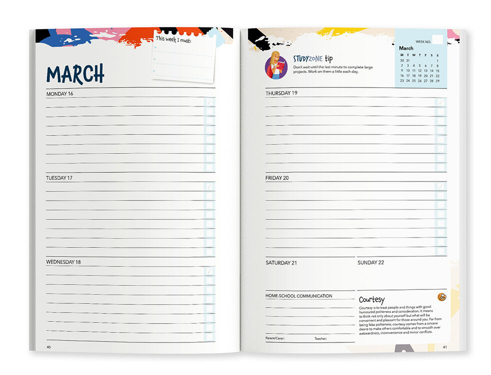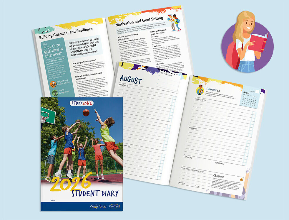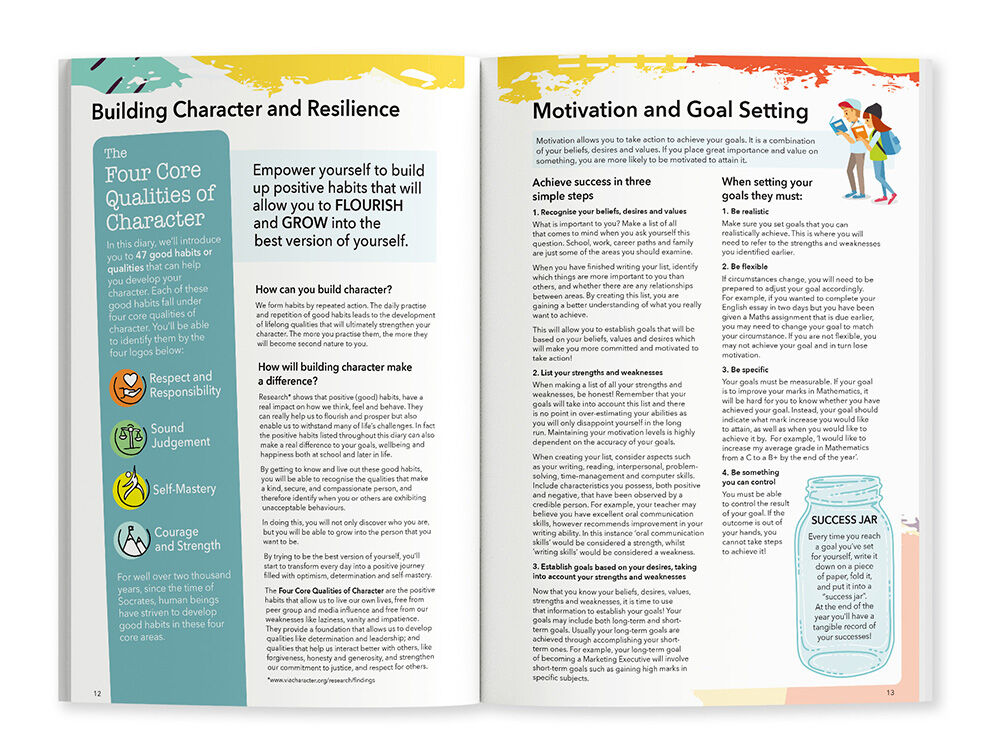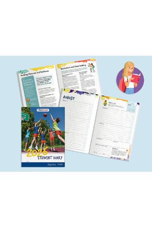 This diary provides a dated, weekly format with plenty of space for recording tasks, assignments, and communication between home and school. It also includes motivating study tips and excerpts from the Building Character and Resilience Program, helping students build both academic success and personal growth.