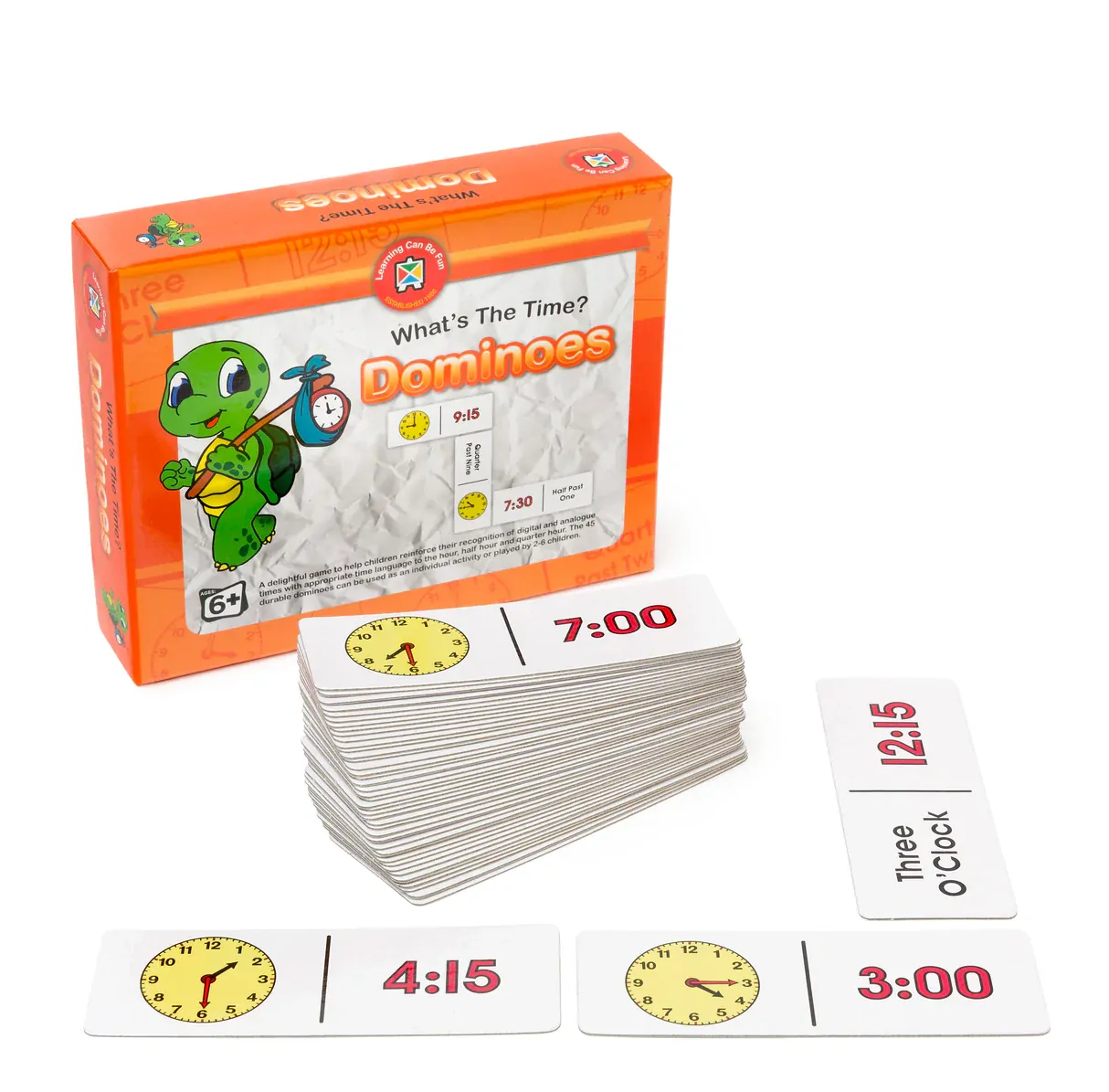Played like ordinary dominoes, Time Dominoes focuses on telling time to the hour, half hour and quarter hour.