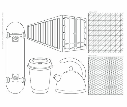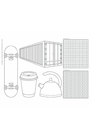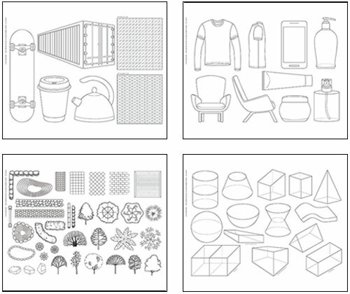 These templates are an ideal design tool for VCD students! To use, place template under a sheet of bleedproof, bank or tracing paper, and use as a starting point for industrial, environmental, landscape and packaging design. Great for marker rendering exercises and illustrations. This set of assorted templates includes 3D forms, starting points, common objects, landscape elements, isometric and oblique grids. 300gsm cardboard made from 100% post consumer waste – designed to be used as templates for tracing; not drawn directly on to. Set of 4 designs.