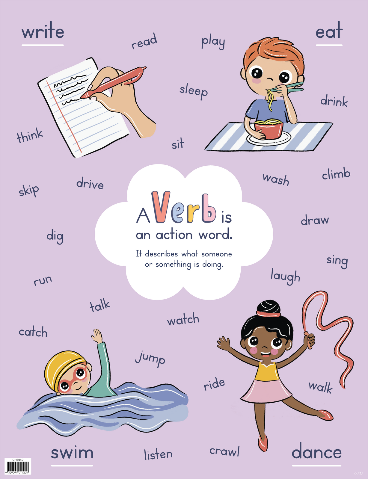 The chart measures 42cm x 55cm, offering ample space for a variety of commonly used verbs, each accompanied by an engaging illustration that brings the action words to life. Children can see characters writing, swimming, dancing, and eating, helping them to associate verbs with corresponding actions.