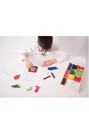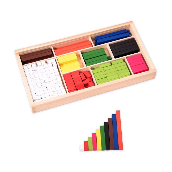 The set includes rods in a vibrant spectrum of colours: orange, blue, brown, black, dark green, yellow, pink, light green, red, and white, all crafted from durable, smooth wood. This colourful variety not only captures children’s attention but also enhances their learning experience by enabling them to visualise and understand complex concepts such as fractions, algebra, arithmetic, probability, and place value.