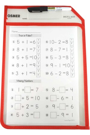 Write on/Wipe off A4 Erasable sleeve - with black whiteboard marker. 4 assorted colours - Orange, Green, Blue and Red (picked at random). Side opening for ease of inserting and removing work sheets. Photocopied sheets can be used many times - save on costs and less paper consumed.